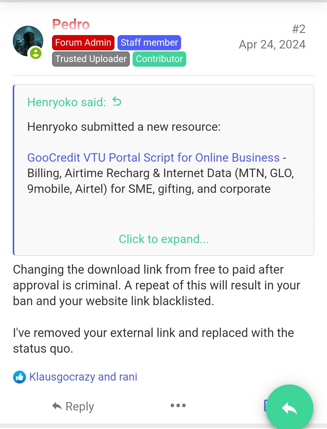 Please understand this, from the conception of our publication on this platform. we didnt post a free script. We added /download-free-vtu-software-script-with-goocredit-api-vtu-294 at the publication. Which was later changed. And this was not done by us.